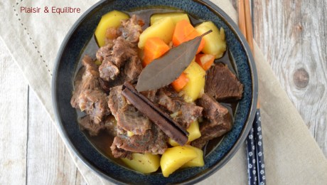 Le ragoût de bœuf chinois aux pommes de terre se compose de bœuf à braiser qui cuit longuement dans un bouillon très parfumé avec des épices comme l’anis étoilé et la cannelle et du vin de Shaoxing et de la sauce soja. En fin de cuisson sont ajoutés des pommes de terre et des carottes.