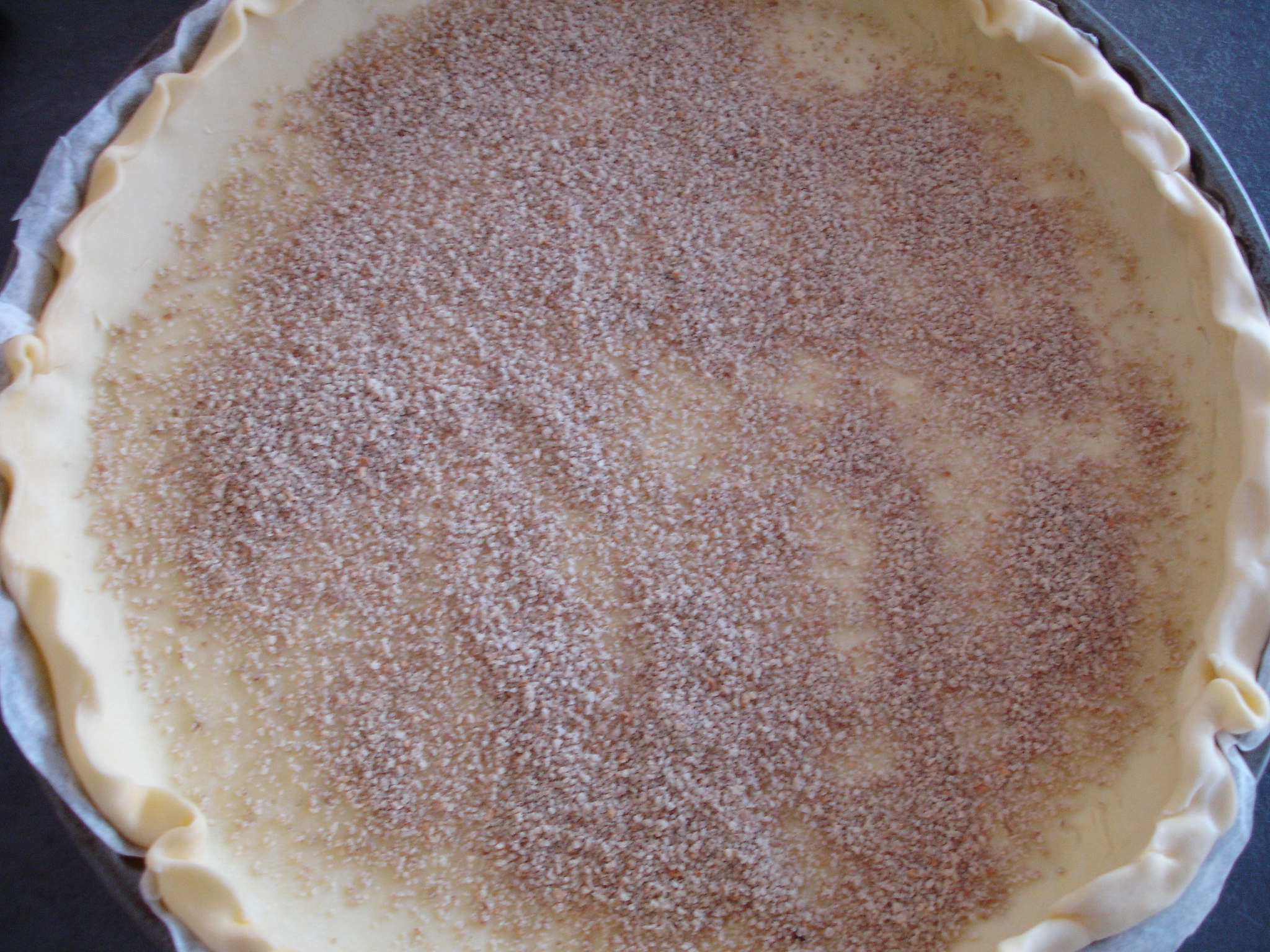 Le plus délicat est d’arriver à ce que la pâte soit bien croustillante, c’est pour ça qu’après avoir piqué mon fond de tarte je le saupoudre largement de chapelure.