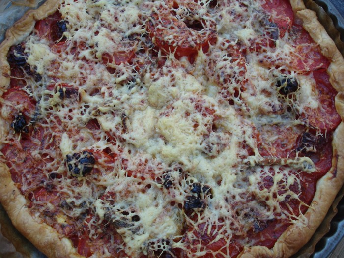 Disposez les fines rondelles de tomates, les tomates confites coupées en dés puis les anchois et les olives. Saupoudrez (largement pour moi) d’origan et couvrez de gruyère râpé.