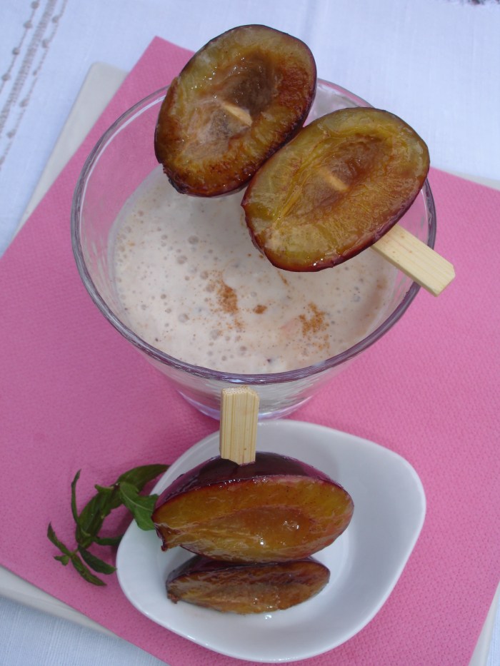 Et pour un en-cas plus gourmand, on peut remplacer le sucre et la cannelle par une boule de glace à la cannelle (du commerce ou faite maison : à venir) mixée avec les quetsches et les yaourts.