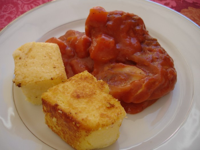 Verser la polenta dans un plat carré ou rectangulaire. Lorsqu’elle est refroidie, mettre au réfrigérateur au moins 5 heures. Le lendemain, découper la polenta en carrés et les faire revenir dans une poêle avec du beurre.