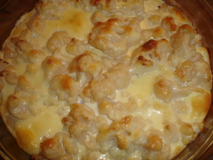 Placer les bouquets de chou-fleur dans un plat à gratin, verser dessus le mélange précédent.
