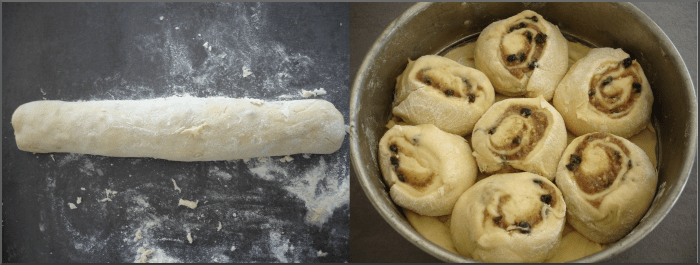 3- Assemblage : Fariner le plan de travail. Prélever environ 60 g de pâte et l’étaler en un disque équivalent au diamètre du moule. Le placer au fond du moule à manqué beurré. Étaler le reste de pâte en un rectangle. Y répartir de manière homogène la masse à fourrer et les raisins secs. Rouler la pâte dans sa longueur et découper le boudin en 7 tranches de 3 cm d’épaisseur environ. Déposer ces tranches sur le fond de pâte sans qu’elles se touchent. Laisser lever dans un endroit tiède durant 30 minutes.