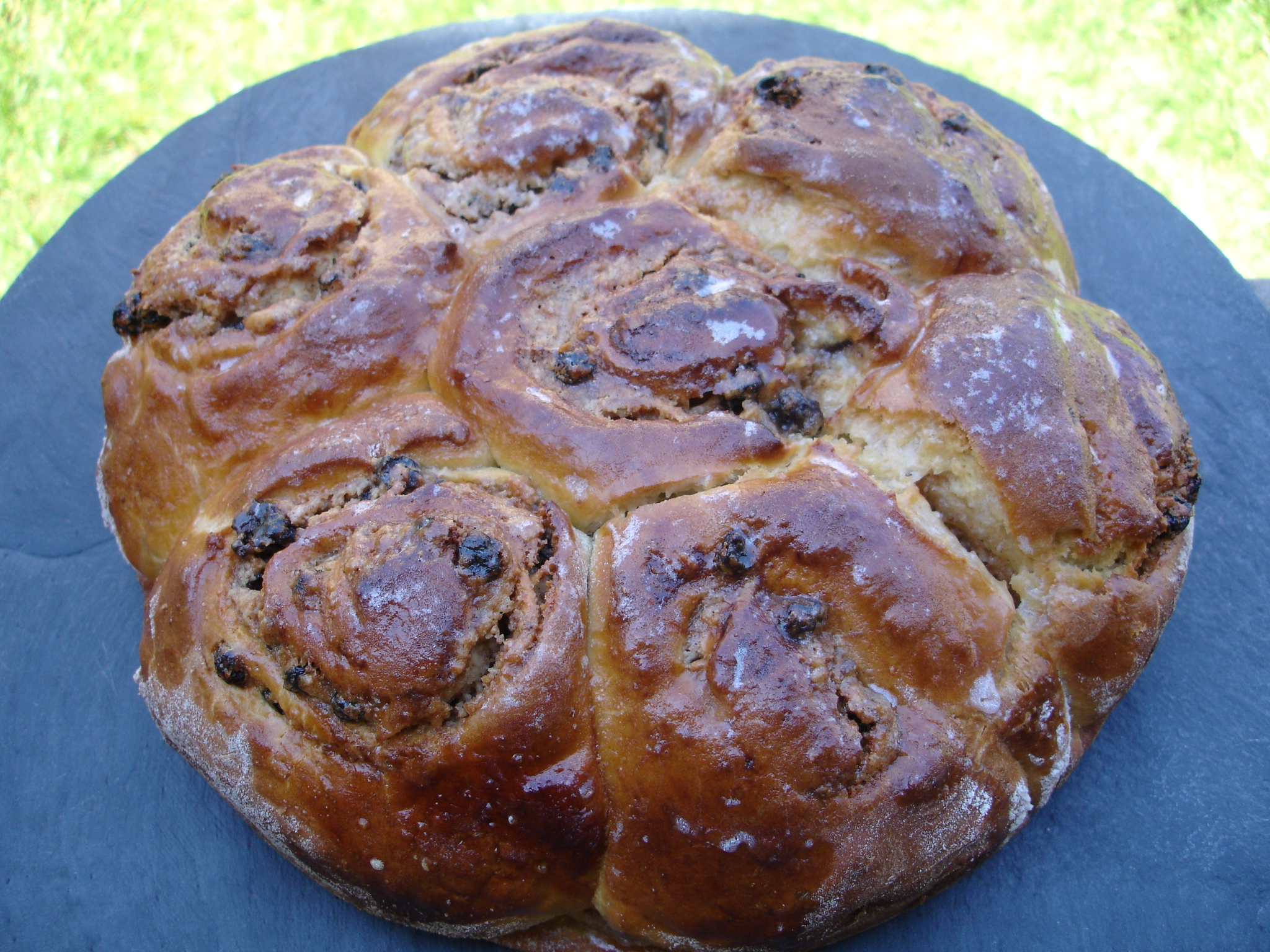3- Assemblage : Fariner le plan de travail. Prélever environ 60 g de pâte et l’étaler en un disque équivalent au diamètre du moule. Le placer au fond du moule à manqué beurré. Étaler le reste de pâte en un rectangle. Y répartir de manière homogène la masse à fourrer et les raisins secs. Rouler la pâte dans sa longueur et découper le boudin en 7 tranches de 3 cm d’épaisseur environ. Déposer ces tranches sur le fond de pâte sans qu’elles se touchent. Laisser lever dans un endroit tiède durant 30 minutes.