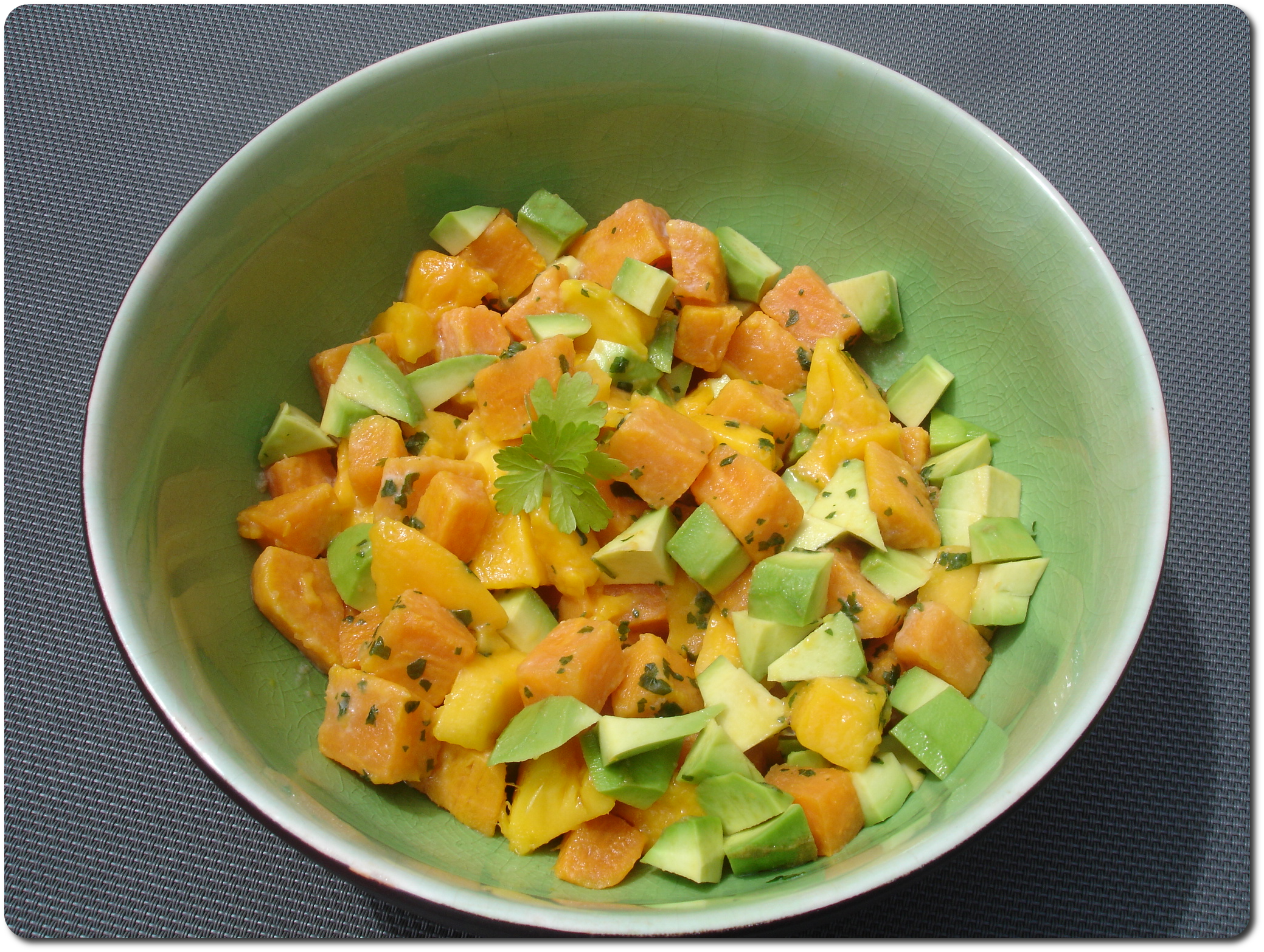 Quand la saison des barbecues arrive, je suis toujours à la recherche de petites salades simples et rapides à faire pour accompagner les grillades. J’aime bien cette salade colorée de patate douce, avocat et mangue, parfumée à la coriandre, servie bien fraîche.
