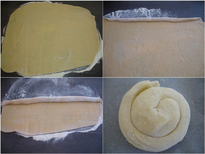 Étaler chaque pâton à l’aide d’un rouleau à pâtisserie en forme de rectangles très fins. Badigeonner chaque pâton de beurre fondu. Rouler chaque rectangle en un boudin dans le sens de la longueur. Rouler les boudins en forme d’escargot. Humecter légèrement la fin des boudins avec un peu d’eau tiède pour bien faire adhérer les escargots.