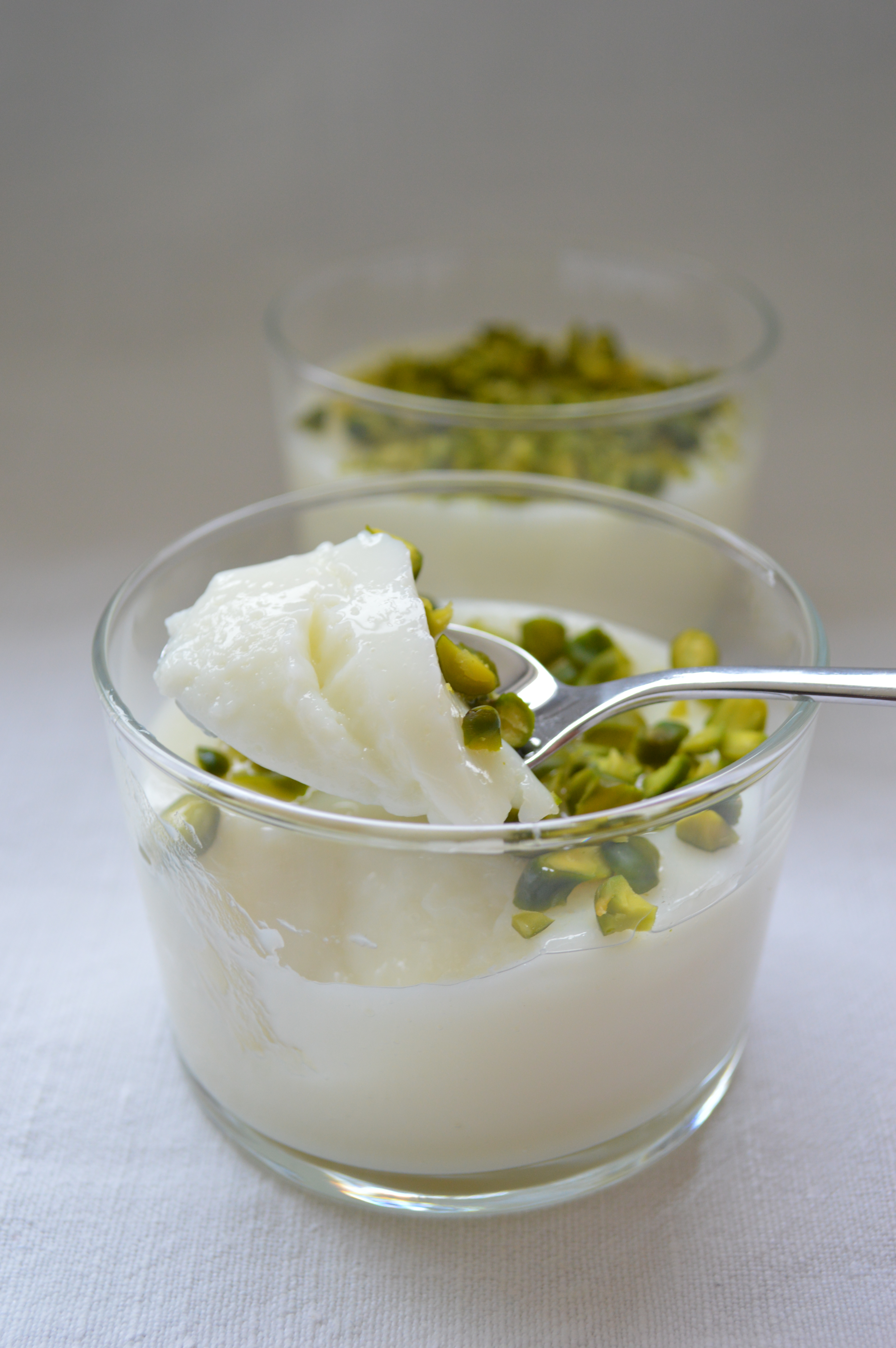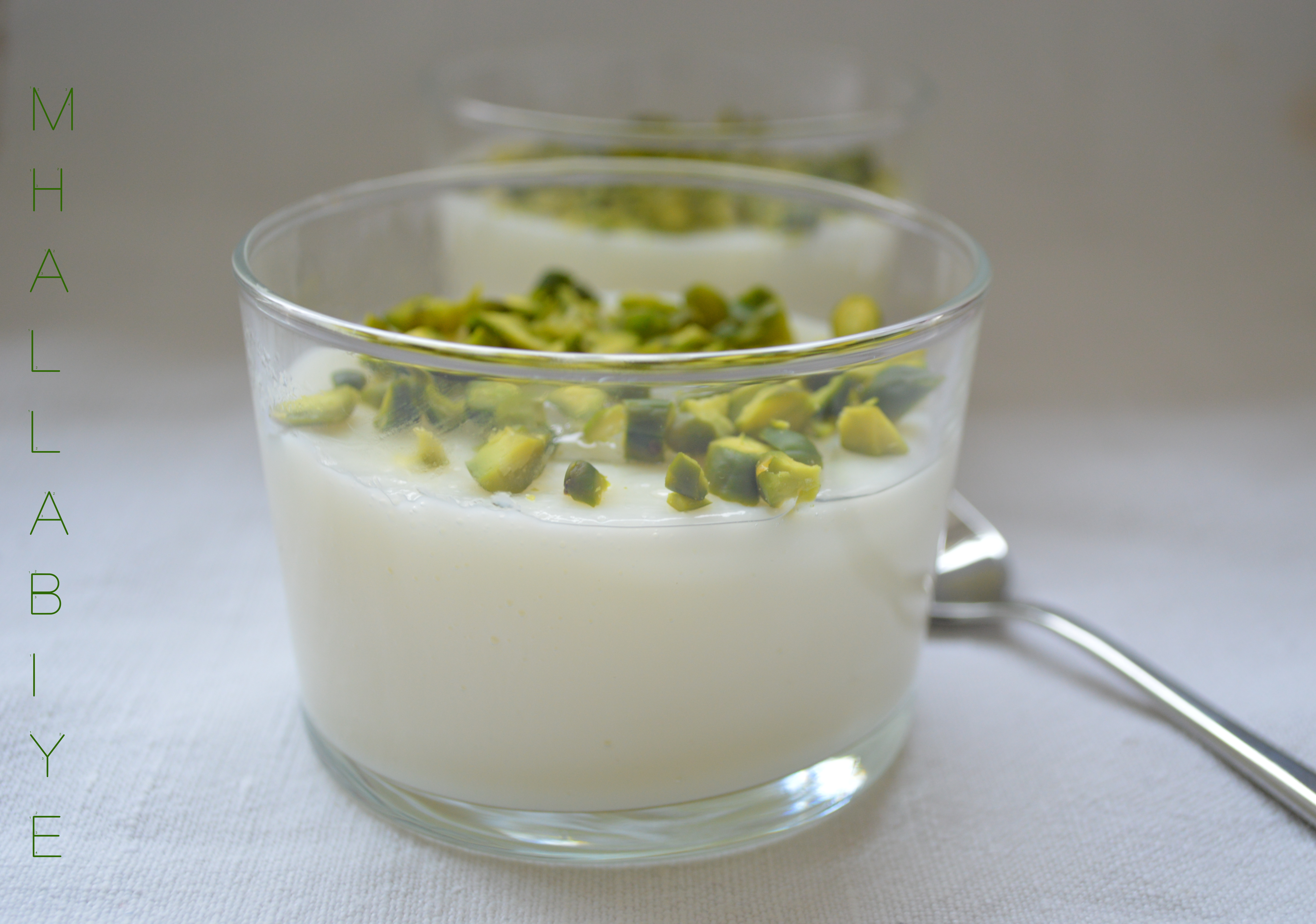 Parce que ça faisait longtemps que je n’avais pas publié de dessert. Voici un dessert frais et pas trop calorique pour l’été, le Mhallabiye ou Mouhalabieh, une crème de lait délicatement parfumée à l’eau de fleur d’oranger servie avec des pistaches. C’est une spécialité libanaise délicieuse ! Je l’ai trouvée sur le blog de La vie quotidienne de Flaure.