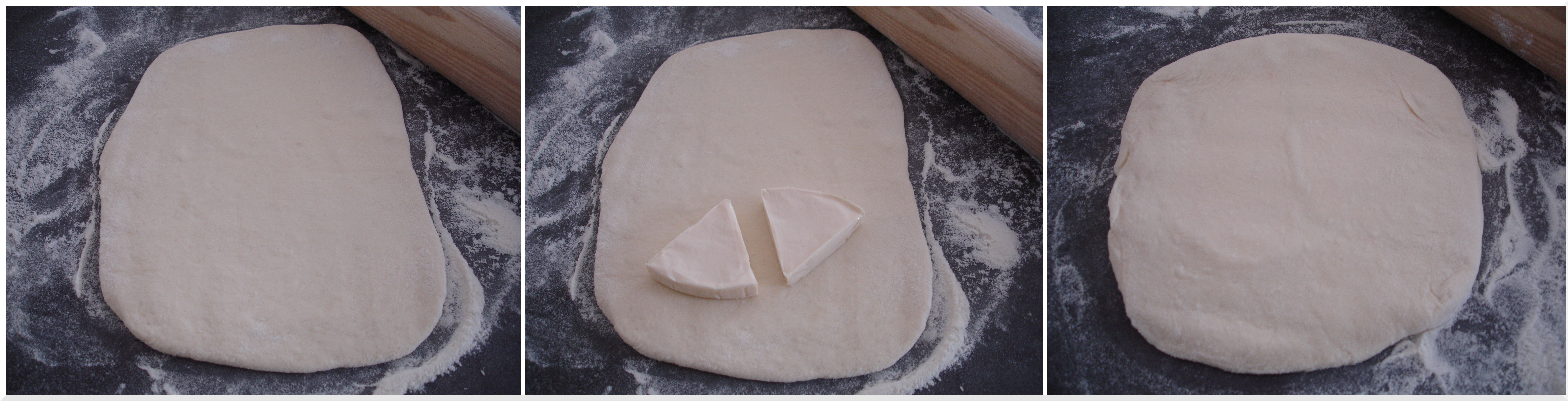 Disposez 2 vache qui rit sur chaque moitié et rabattre la pâte. Puis, avec le rouleau à pâtisserie, étaler à nouveau la pâte pour obtenir un rond fin.