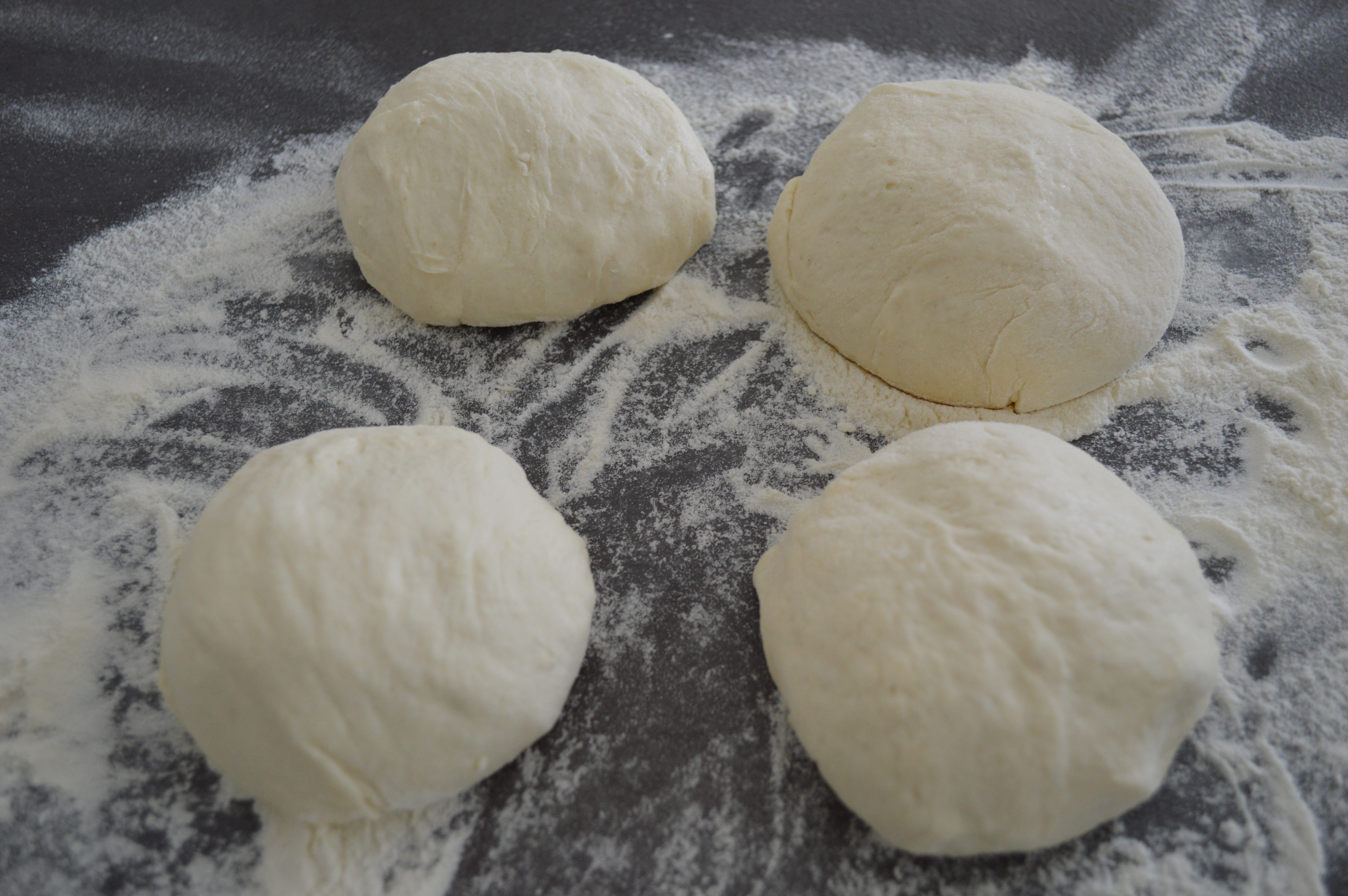 Fariner le plan de travail, découper la pâte en 4 morceaux de même poids. Les mettre en boule.