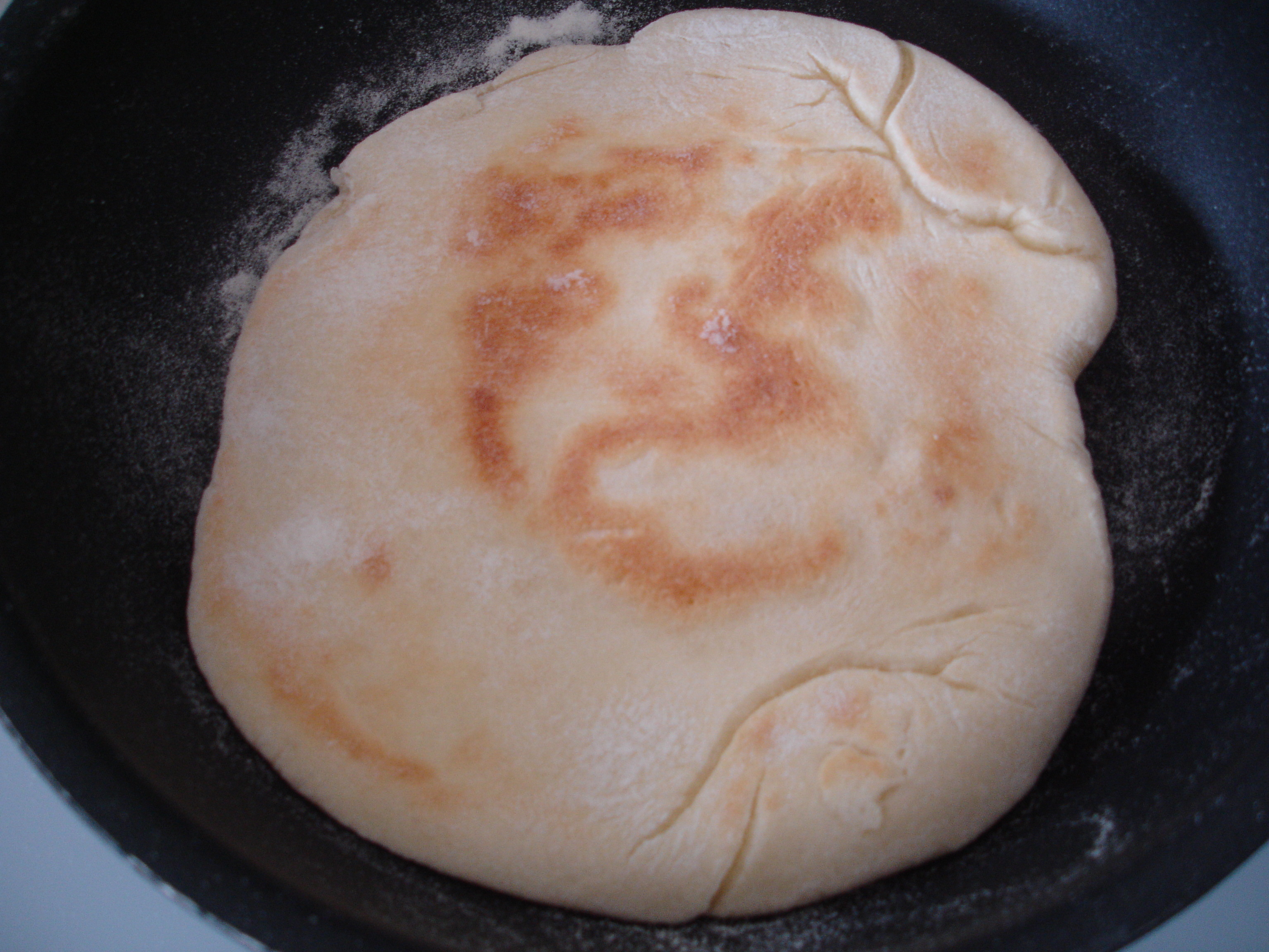 Cheese naansDans une poêle anti-adhésive, faire chauffer (sans mettre de matière grasse), puis déposer le naan, le faire cuire à feu moyen durant 4-5 minutes de chaque côté.