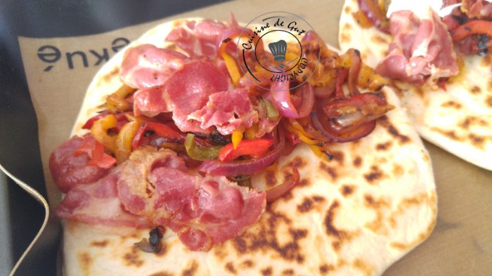 Enfin c’est mon amie Claudine du blog Cuisine de Gut qui a choisi de faire ma piadina. avec une garniture différente de la mienne, pancetta, poivron et mozzarella qui doit être un délice. Et comme elle le dit : « Je n’ai pas l’habitude de ce type de repas qui fait appel au pain comme plat principal : burgers, bruschetta, tortillas, wraps ne sont pas souvent sur ma table mais il est vrai que ça fait un très bon repas ! Lorsque la garniture est bonne on se régale même !! ». Et ce qui est drôle chez Claudine, c’est qu’elle n’a pas pu s’empêcher de manger du pain avec sa piadina, tellement elle aime ça ! Je pense que je n’ai plus à vous présenter Claudine, vous savez maintenant que je suis assidument son blog et que ce n’est pas rare que je refasse ses recettes, toujours une réussite ! Allez faire un tour sur son blog, vous y trouverez de belles inspirations et de magnifiques recettes !