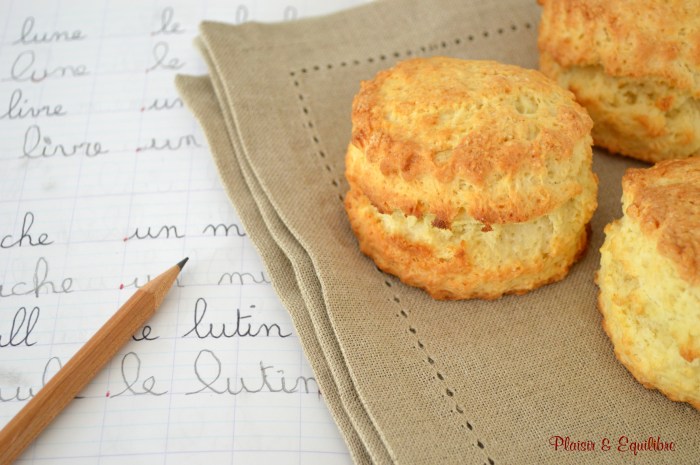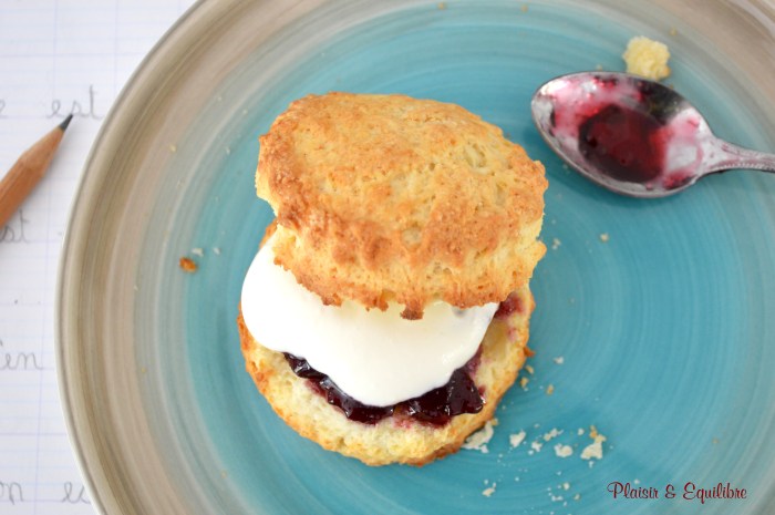 Après des vacances qui se sont un peu rallongées, je suis contente de vous retrouver ! La rentrée des enfants est pour demain, enfin sauf mon fils aîné qui a déjà eu sa rentrée vendredi après-midi. Aussi je vous propose une recette de circonstance pour gâter vos enfants au petit-déjeuner de ce premier jour d’école, des scones anglais. Ce sont ces fameux petits pains d’origine écossaise que l’on déguste à l’heure du thé ou au petit-déjeuner. Les scones sont très faciles et rapides à faire. La pâte doit être à peine travaillée et cuite aussitôt à four chaud. J’ai découvert les scones lors de mon premier voyage en Angleterre, à Saltdean, il y a plusieurs années. Après une longue balade sous la pluie, nous avons été accueillis pour l’heure du thé. La pluie frappait encore les carreaux mais confortablement installée dans un fauteuil profond, la douceur est revenue sur mon visage avec ces délicieux scones accompagnés de crème fouettée… Ils sont merveilleux ! J’ai trouvé la recette dans un livre de ma mère dont je ne me souviens plus le titre. Seule petite modification que j’ai faite, le sucre, il n’y en avait pas visiblement, j’ai préféré en ajouter.