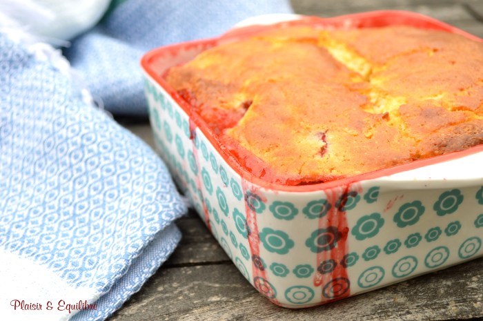 C’est ma soeur qui m’a fait découvrir ce dessert qui trouve ses origines aux Etats-Unis. Le cobbler est un peu le cousin du crumble, tout comme lui, le cobbler est composé de fruits qui sont recouverts d’une pâte. Mais pour le crumble, il s’agit plutôt d’une pâte friable et croquante déposée en miettes alors que le cobbler présente sur le dessus une pâte qui ressemble plus à un gâteau car elle gonfle un peu grâce à la présence de levure. Et forcément, comme ma soeur me l’avait proposé avec le duo fraises rhubarbe, j’étais sûre de succomber ! Ce dessert est moins sucré que le crumble mais c’est parfait pour pouvoir bien profiter de l’acidulé des fraises et de la rhubarbe. Comme j’avais fait ce dessert juste pour nous, j’avais décidé de faire la moitié de la quantité indiquée et j’ai pris un moule de petite taille, et bien sûr ça n’a pas loupé, mon plat a débordé (heureusement qu’il existe la pyrolyse !)… Vous pouvez décliner ce dessert avec toute sorte de fruits, myrtilles, mûres, framboises, pêches, nectarines,… et généralement, on l’accompagne d’une boule de glace. Je vous laisse découvrir tout de suite sa recette.