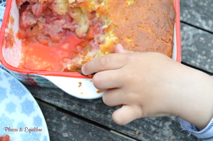 A priori, ce dessert a déjà un jeune amateur (trop mignon cette petite main). Fraises et rhubarbe, c’est un mariage qui marche à tous les coups . Bises Laurence