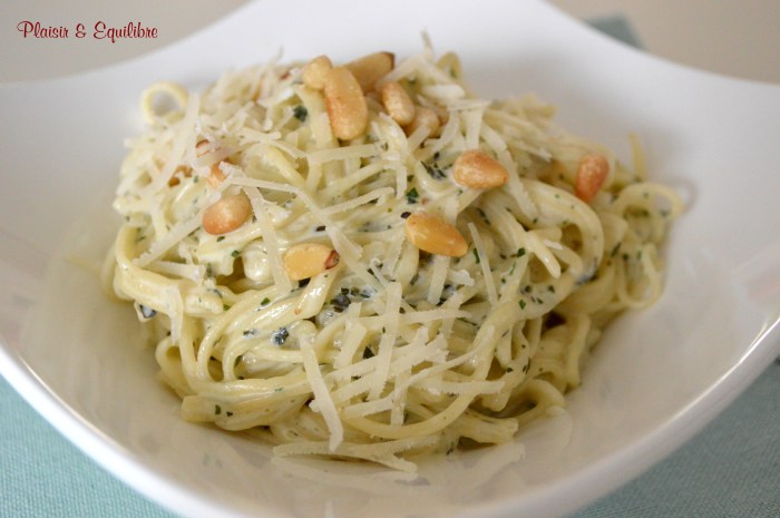 J’ai encore du basilic dans ma jardinière, alors demain, je préparerai la crème de basilic et la servirai avec les pâtes (pas maison). Je suis fan des pignons de pin (sur le salé, comme le sucré).