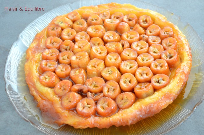 Pour me faire pardonner d’avoir été absente aussi longtemps, je reviens avec une belle douceur sucrée plutôt facile à faire, une tatin de banane. J’ai eu beaucoup de choses à régler ces derniers temps et je n’ai pas eu de temps à consacrer au blog ni beaucoup de temps pour cuisiner. Enfin j’espère que ce dessert du jour vous plaira, nous, il nous a complètement emballé ! Je suis très friande de tarte tatin en général et la banane caramélisée, j’adore. C’est d’ailleurs assez souvent que je nous fais des bananes caramélisées à la poêle en fin de repas comme dessert rapide. Comme je voulais vraiment qu’elle soit savoureuse, j’ai fait ma pâte feuilletée maison avec la technique escargot qui est beaucoup plus rapide que la pâte traditionnelle, mais bien sûr une pâte feuilletée du commerce fera aussi l’affaire. J’ai hésité pour la découpe des bananes, très souvent les bananes sont coupées en deux dans la longueur mais j’ai finalement opté pour de grosses rondelles. J’aime beaucoup les deux présentations, à vous de choisir celle que vous préférez. Et c’est bien sûr chez mon amie Claudine du blog Cuisine de Gut que j’ai prélevé la recette et, comme d’habitude, je m’en doutais, c’est une réussite ! Je crois bien d’ailleurs que j’aurais pu en faire deux, nous nous serions bien tous resservis !
