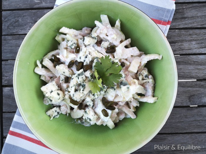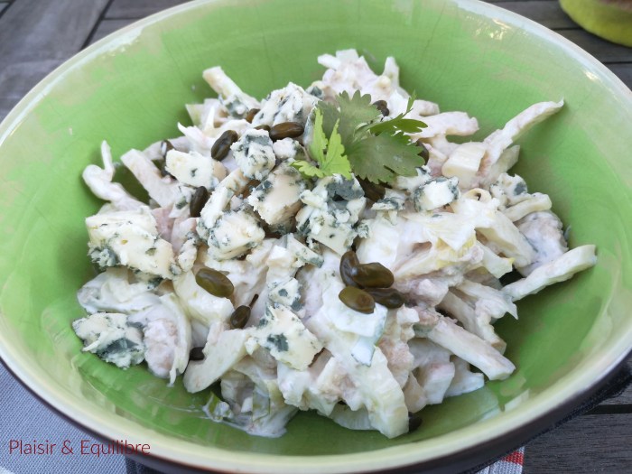 J’espère que vous aimez le fenouil, parce que c’est un légume que j’apprécie énormément qu’il soit cuit ou cru. J’avoue le cuisiner plus souvent cuit car je manque parfois d’idée pour l’accommoder en salade. Sa saveur anisée sublime le poisson, ce légume ne ressemble à aucun autre et il est tellement croquant quand il est cru et tellement fondant quand il est cuit qu’il revient régulièrement dans mes menus. Ici il s’agit plutôt d’une salade complète qui nous a servi à plusieurs reprises déjà de déjeuner, mais il est tout à fait possible de la proposer en entrée ou en accompagnement de grillade en ne mettant pas le thon. Cette salade est une explosion de parfums ! Elle a eu beaucoup de succès et elle sera encore plusieurs fois à ma table durant cet été. J’ai choisi de servir le fenouil entièrement cru mais vous pouvez aussi le faire cuire préalablement et le refroidir. Le mariage roquefort-fenouil fonctionne très très bien et la sauce au yaourt apporte de la douceur à cette salade. C’est à nouveau chez mon amie Marie du blog Cooking 4 You que j’ai trouvé cette belle recette.