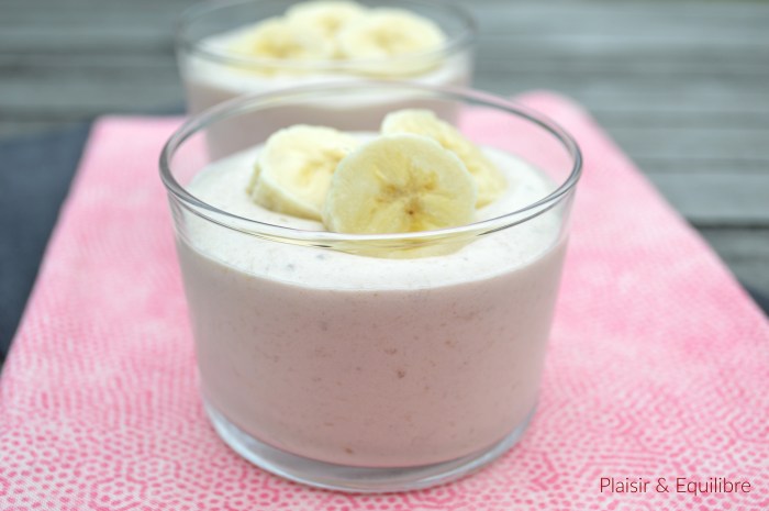 Bien que ce soit la saison des fruits rouges, les bananes sont toujours présentes dans la corbeille à fruits. Mais c’est toujours pareil, je finis toujours par en avoir qui commencent à noircir et qu’il faut se dépêcher de manger. Très souvent je fais des cookies à la banane, flocons d’avoine et coco mais avec le retour de la chaleur, plus très envie d’allumer le four. Cette mousse à la banane est aussi très rapide à faire et donne à nouveau envie de manger les bananes qui restent ! Toute douce et bien fraîche, cette mousse à la banane est une belle gourmandise que j’ai trouvée chez Christelle du blog La cuisine de poupoule et que je propose au défi mousses de ce mois de Recettes.de.