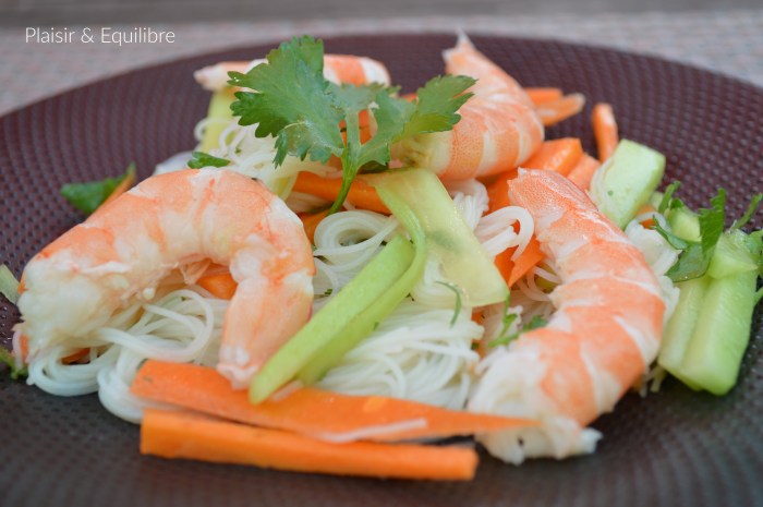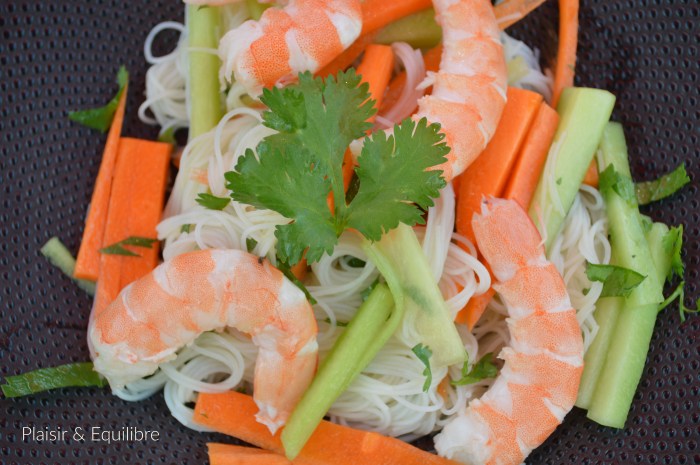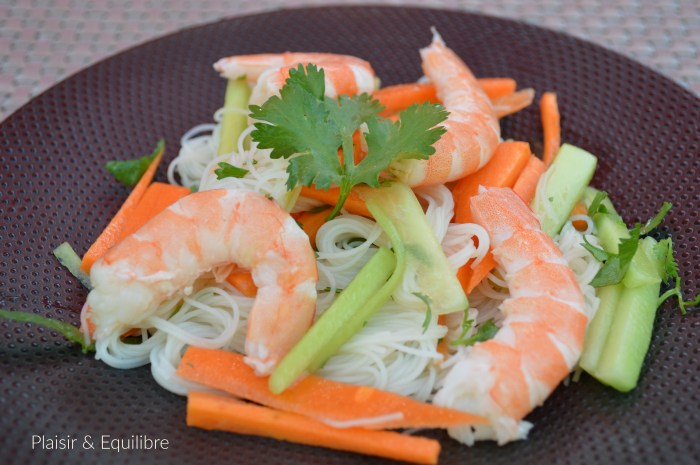 À la maison on est fan de cuisine asiatique et plus particulièrement de cuisine thaïlandaise que je trouve parfumée, saine et délicate ! Les plats sont un assemblage de saveurs qui laisse rêveur à chaque bouchée ! Il y a quelques années, je suis allée en Thaïlande et je regrette de ne pas avoir mieux retenu les plats que j’avais mangés. Aujourd’hui j’aurais beaucoup aimé les refaire. Même dans les petits restaurants pas chers, la nourriture était excellente ! Certes, souvent trop épicée à mon goût (je crois que mon palais s’en souvient encore !). Cette salade est toute simple mais très rafraîchissante et parfumée. Je me suis un peu inspirée de cette recette du magazine Régal et pour la sauce, j’ai repris la sauce du Bo Bun parce que je la trouve irrésistible !