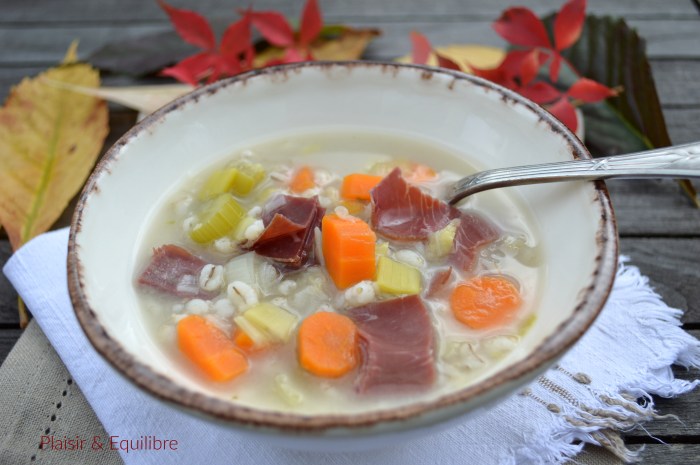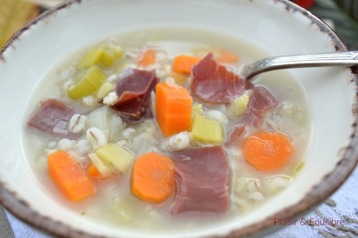 J’ai essayé de prolonger l’été au maximum mais un petit virus grippal m’a bien remis en tête que nous sommes bien en automne. Nous nous dirigeons vers l’hiver malgré des journées chaudes qui s’invitent encore de temps en temps. Un besoin de réconfort et de chaleur m’a fait repenser à cette soupe du canton des Grisons en Suisse. Une soupe à base d’orge perlé, de légumes et de viande des Grisons. J’apprécie énormément les soupes avec morceaux qui sont bien consistantes et permettent de faire un bon repas du soir. Il me semblait avoir déjà goûté à l’orge perlé mais j’avoue ne plus me rappeler comment. J’ai retrouvé ce petit goût de noisette très agréable. Je suis contente car j’ai bien réussi sa cuisson, il était fondant. Je me suis fiée aux indications du paquet en laissant tremper l’orge perlé dans l’eau la veille. Une soupe très parfumée avec des légumes de saison, poireau, carotte, chou et céleri. J’ai mis du céleri branche qui me restait à la place du céleri rave que je n’avais pas en stock mais la prochaine fois je tenterai avec. Le petit goût fumé et spécifique de la viande des Grisons est charmant et transporte dans l’ambiance des montagnes le temps du repas. Je ne peux que vous conseiller de vous laisser tenter !