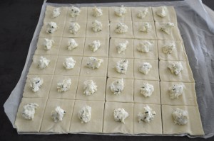 Déposer une ½ cuillère à café de ce mélange sur chaque carré de pâte.