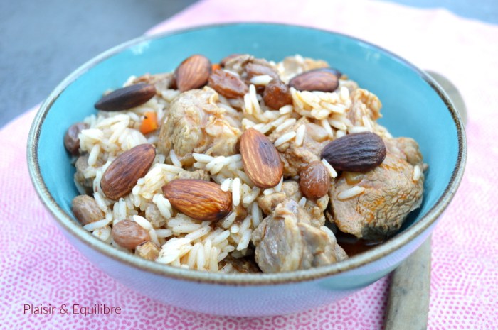 L’agneau qui mijote dans les épices, le riz qui s’imprègne de cette sauce épicée, des amandes grillées, des raisins secs qui apportent une petite note sucrée, ce plat saoudien, lorsque je l’ai vu chez Samar du blog Mes inspirations culinaires m’a tout de suite tenté et je n’ai pas tardé à le réaliser. Mais j’ai attendu aujourd’hui pour le publier pour accompagner mon amie Sophie dans son geste d’amitié pour le monde à travers son association Cuisiner pour la Paix en fêtant la fête nationale de l’Arabie Saoudite. Je n’avais pas les épices Baharat qui sont normalement dans ce plat aussi j’ai essayé de reproduire au maximum ce mélange du Moyen Orient en le faisant moi-même. Le Kabsa traditionnel est à base de poulet mais cette version à l’agneau est délectable !