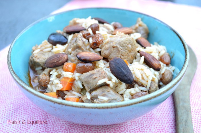 Servir le riz à l’agneau dans un plat et ajouter les amandes sur le dessus.