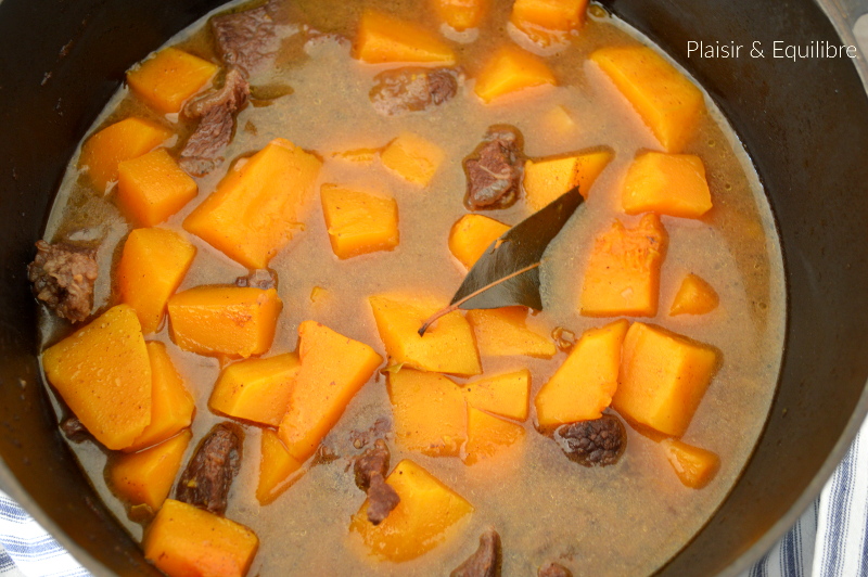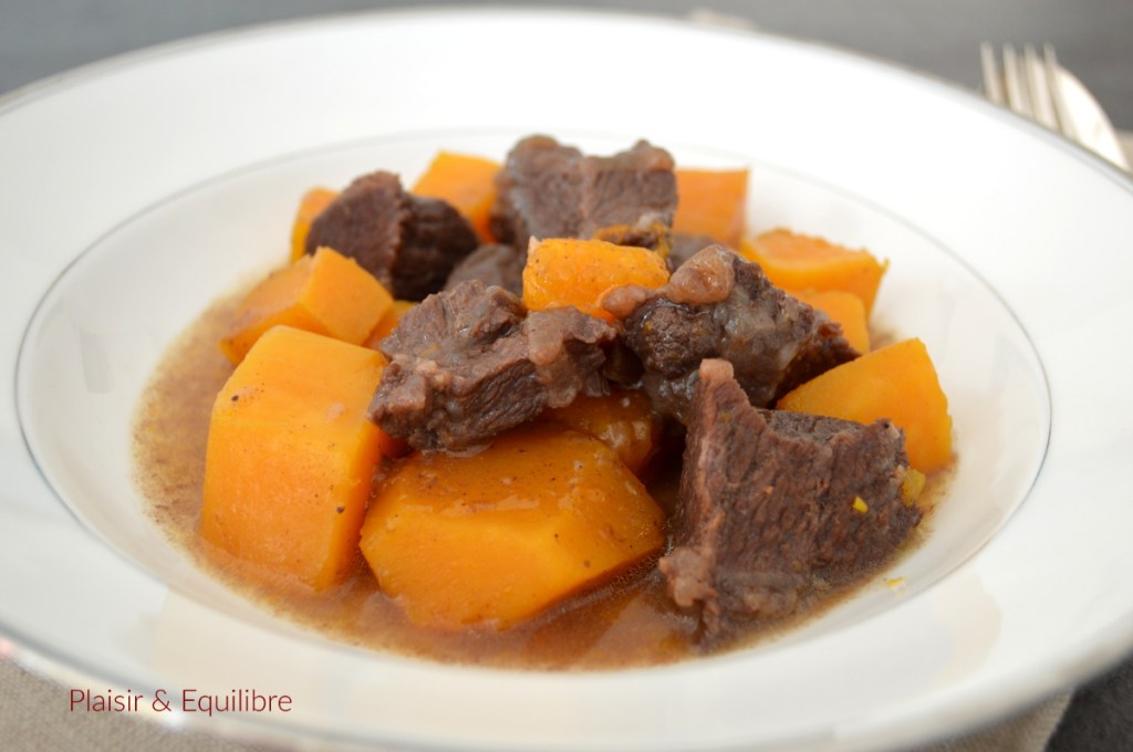 Le week-end dernier, j’avais dans l’idée de faire un bœuf bourguignon avec des joues de bœuf car j’adore cette viande, fondante à souhait lorsqu’elle a longuement mijoté. J’ai donc acheté une belle joue de 700 g. J’avais également acheté une courge butternut pour participer au défi de Recettes.de. Finalement je n’avais pas trop d’idées ce dimanche qui me venaient pour le défi, par contre l’idée de faire un mijoté de bœuf avec cette courge m’a bien tenté. Un peu à la manière de la pumpkin pie, j’ai eu envie de parfumer ce mijoté au quatre épices et le résultat a été accueilli avec beaucoup d’enthousiasme ! La joue de bœuf, tout le monde n’aime pas mais quand elle mijote tout doucement pendant plusieurs heures, c’est sublime ! Vous pouvez bien sûr la remplacer par d’autres morceaux (paleron, gîte, jarret,…). Un plat qui réchauffe, à faire quand on reste tranquillement à la maison. Cette joue de bœuf est suffisante avec la butternut mais vous pouvez ajouter un peu de semoule ou de riz pour que ce plat soit encore plus complet. Et je propose donc ce petit mijoté pour le nouveau défi de ce mois de Recettes.de dont le thème est « les courges ».
