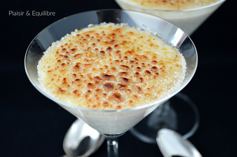 Le riz au lait est un dessert que j’affectionne beaucoup mais comme il est assez long à préparer, je n’en fais que rarement. Le nouveau thème du Foodista challenge, ce challenge culinaire amical créé par Stéphanie du blog Cuisine moi un mouton, étant Le riz au lait, dessert ‘doudou’ qui nous plait ! m’a donné une bonne raison de faire ce dessert et cela tombait bien avec les vacances j’ai eu un peu de temps pour faire une proposition. C’est Viviane du blog Quoi qu’on mange ? qui est la marraine du Foodista Challenge #70 et qui a eu cette belle idée, avec un accessoire imposé, la présentation dans un pot en verre. Pour changer de la vanille que j’utilise habituellement pour le parfumer, j’ai choisi la fève tonka dont les arômes entre le caramel, la vanille et l’amande subliment les desserts. La fève tonka provient d’un arbre gigantesque, le teck et est originaire d’Amérique du Sud. Cette graine toute noire est très puissante en parfums. Et pour que ce riz au lait soit encore plus gourmand, j’ai choisi de le brûler comme une crème brûlée pour créer une fine couche croquante sur la surface. Je ne vous dis pas comme c’est bon ! J’ai choisi de présenter ce riz au lait dans des verres à cocktail, assez évasés pour permettre de les brûler. La recette est celle du chef Philippe Conticini que j’ai trouvée sur le blog d’Angelique Le petit monde de KiwiPatate que j’aime beaucoup. Je l’avais déjà faite une première fois mais il était resté trop liquide, j’ai donc augmenté très légèrement la quantité de riz rond et c’était parfait.