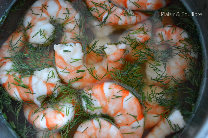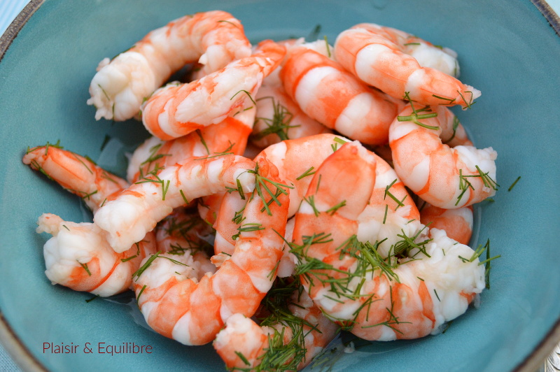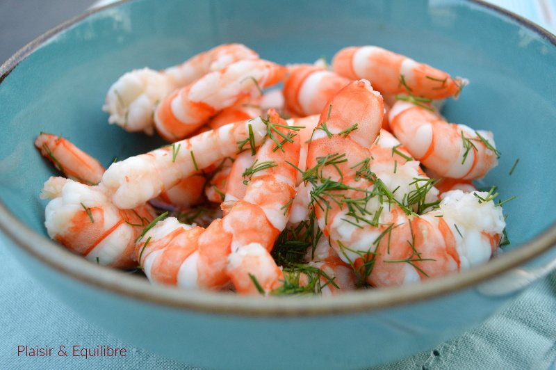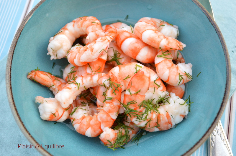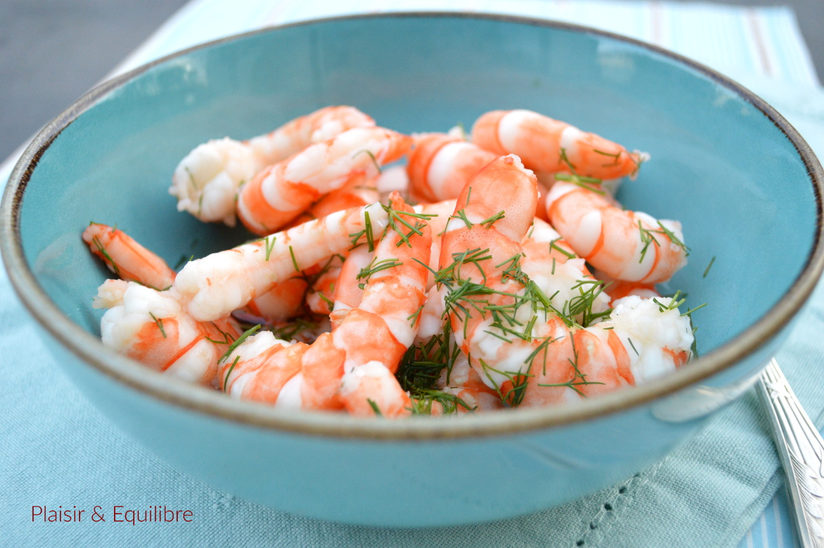 Des crevettes qui auraient dû être des écrevisses pour représenter le kräftor, un plat très populaire en Suède lors de la fête des écrevisses (Kräftskiva en suédois) qui se déroule au mois d’août. Les écrevisses sont cuisinées avec de l’aneth et de la bière, marinées plusieurs heures et mangées avec du pain et du fromage suédois Västerbotten. Mais ce n’est pas la saison des écrevisses et surtout je ne sais pas où en trouver, je vous propose donc une version avec des crevettes qui à mon avis est très certainement tout aussi délicieuse. Servez ces crevettes très parfumées, accompagnées d’un bon pain croustillant ou de tranches de Wasa beurrées au beurre salé et d’une sauce à base de crème fraîche épaisse et de citron.