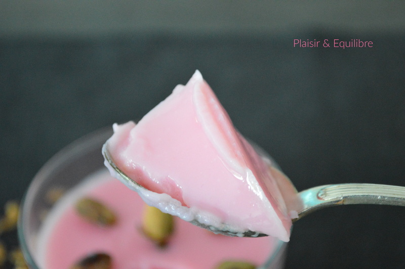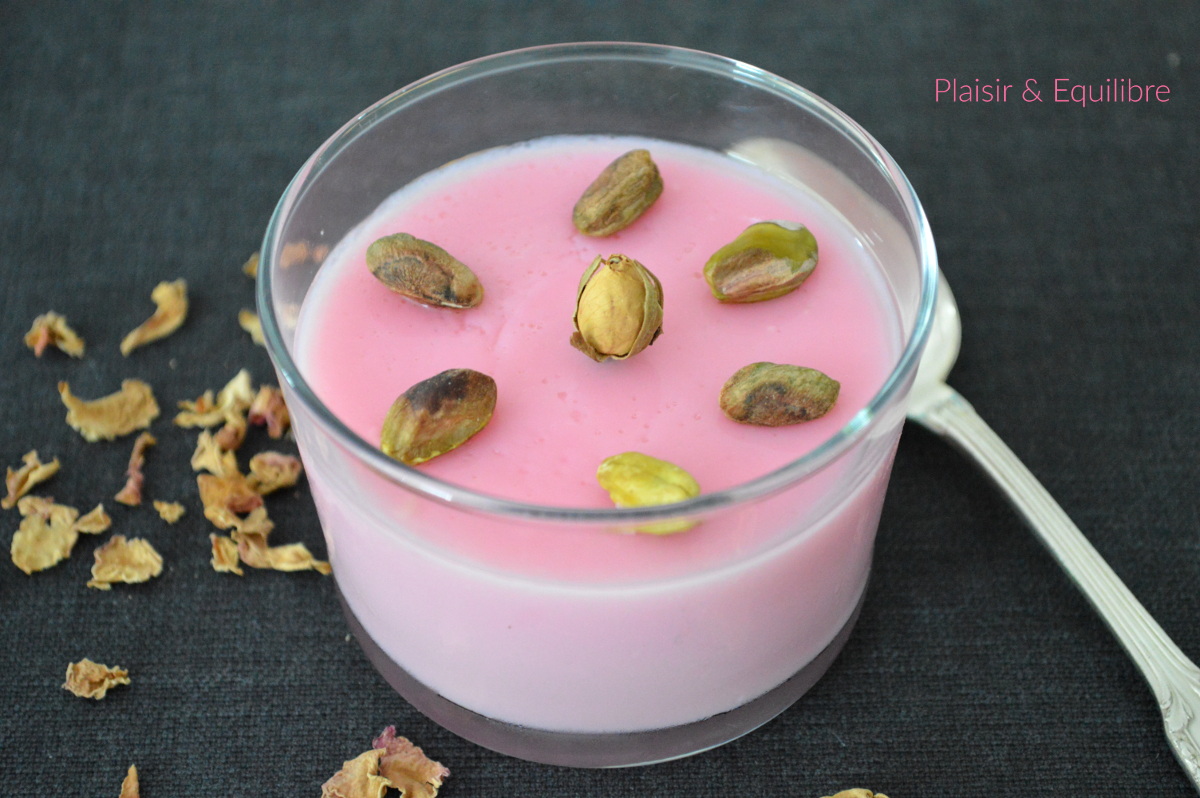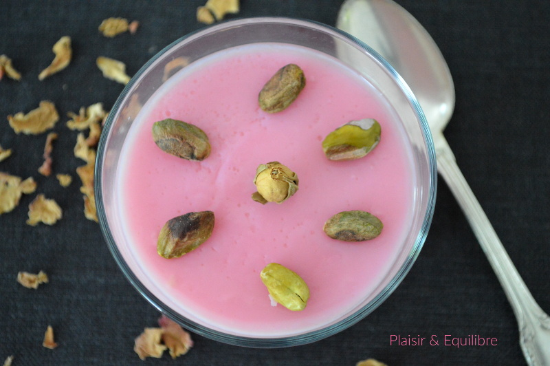 Pour l’occasion, j’ai réalisé un Mouhalabieh ou Mhallabiye, un dessert libanais que j’ai teinté de rose. C’est une crème de lait délicatement parfumée à l’eau de fleur d’oranger servie avec des pistaches. Une recette du chef Christophe Michalak qu’il a publié sur son compte Instagram.