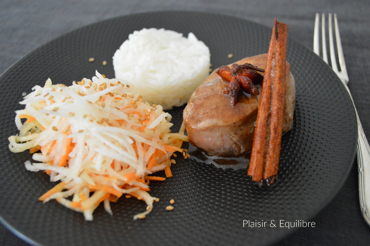 En ce moment, nous rêvons de partir au soleil. Je ne sais pas si mon envie de cuisiner des saveurs asiatiques est liée à mon envie de voyager mais en tout cas, j’aime retrouver les parfums du cinq épice, de la sauce soja et du gingembre dans la cuisine. Quand j’ai servi ce plat, mon tendre a cru que j’avais cuisiné le filet mignon à la réglisse. La marinade et la sauce contiennent effectivement de l’anis étoilé qui en donne l’impression. Ce filet mignon de porc mariné au cinq épices est une recette du chef mauricien, Franco Bowanee, chef au restaurant gastronomique du Château Hôtel de Vault de Lugny 5*. J’ai simplement diminué la quantité d’ail car je ne le digère pas. Comme souvent, j’ai trouvé cette recette sur Pinterest. Le filet mignon est tendre, très parfumé et cette sauce sirupeuse est à tomber ! Je l’ai servi avec du riz et une petite salade de carotte et chou rave râpés enrobés d’une vinaigrette avec une pointe de miel et des graines de sésame.