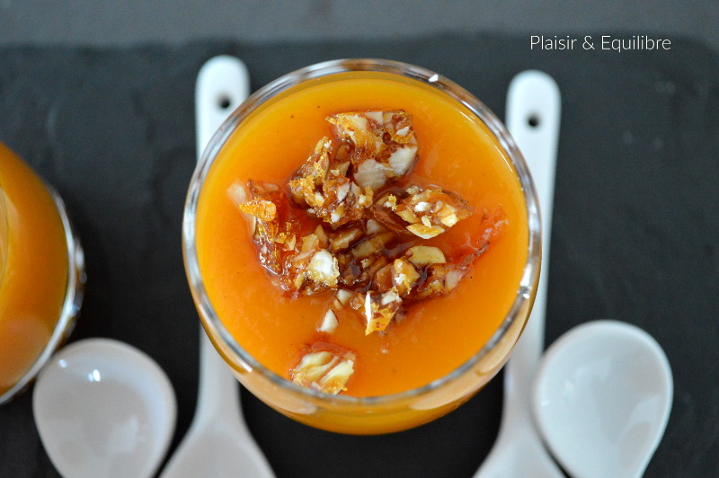 Verser le velouté dans les verrines, ajouter les éclats de nougatine sur le dessus.