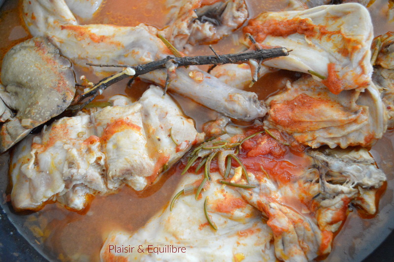 Toute mon enfance, j’ai refusé de manger du lapin, je trouvais cet animal trop mignon pour être mangé. Puis j’ai rencontré mon tendre qui adore le lapin et m’en a réclamé tellement que je me suis résolue à en cuisiner et donc, à en manger. Il faut croire qu’on devient moins sensible avec l’âge 😦 En tout cas, le lapin est une viande délicieuse et très peu grasse. Je le cuisine le plus souvent à la moutarde, je me rends d’ailleurs compte que je n’en ai jamais publié la recette. Mais cette version au romarin et à la bière est aussi un délice ! C’est une recette de mon amie Claudine du délicieux blog Cuisine de Gut. J’ai fait quelques modifications en utilisant de la tomate pelée en conserve, la tomate fraîche n’étant pas encore de saison et j’ai choisi de cuisiner ce lapin à la bière mais vous pouvez le faire au vin blanc comme Claudine. C’est un petit mijoté mais le romarin sent bon le sud et est annonciateur des beaux jours, cette recette donne un avant goût du printemps !