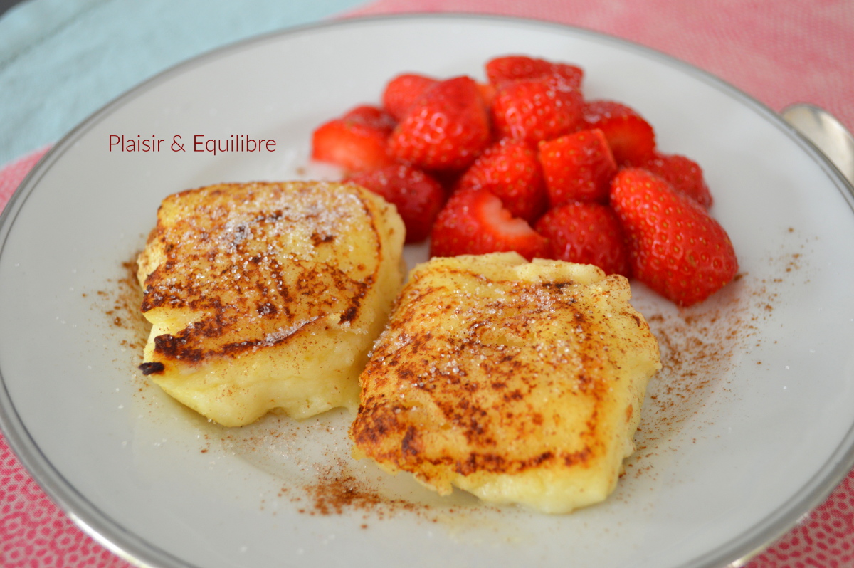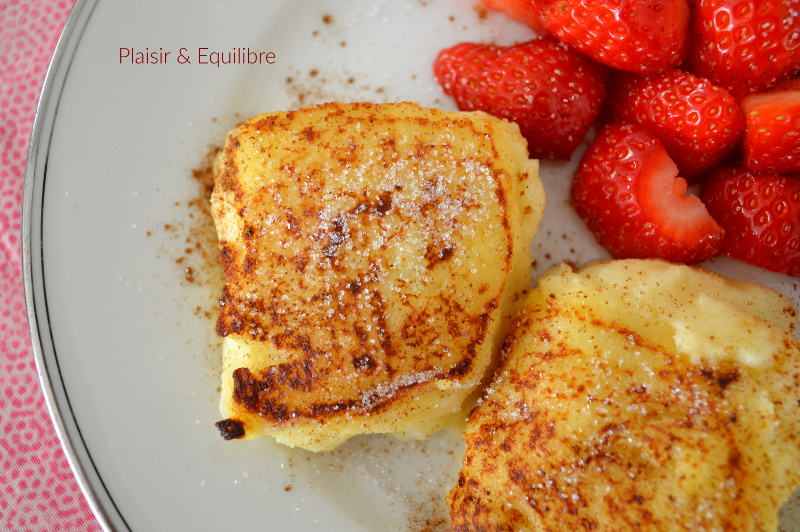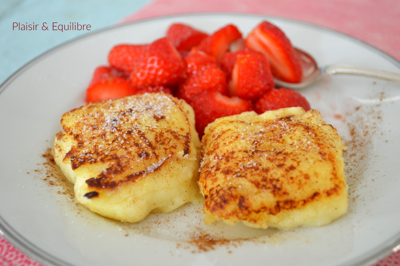 Les griesknepfle, nous les appelions les beignets de semoule dans notre famille, on les retrouve aussi sous le nom galettes ou croquettes de semoule. Ils peuvent être servis en version salée ou sucrée mais chez nous, nous faisions la version sucrée. Le dimanche soir, il arrivait que mon papa prépare ces délicieux beignets de semoule qui nous servaient de dîner. Traditionnellement on accompagne ces beignets de semoule d’une compote de pommes. Mais comme c’est la saison des fraises, je n’ai pas résister à l’envie de les servir avec quelques fraises au sucre. Ces beignets sont revenus dans du beurre, il se forme alors une fine croûte croquante puis ils sont saupoudrés de sucre et de cannelle et sont servis tièdes. J’ai saupoudré les griesknepfle de sucre en poudre mais pour encore plus de gourmandise, vous pouvez choisir le sucre cristallisé dont les grains croqueront sous la dent. C’est un dessert que j’affectionne tout particulièrement ! Le contraste semoule tiède et fraises fraîches ou compote froide est très agréable.