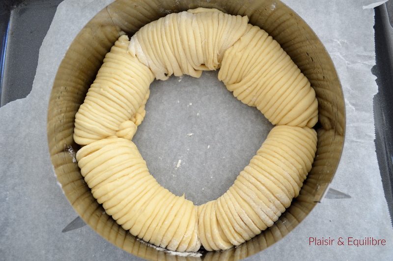 Déposer ces pelotes de laine côte à côte dans un moule beurré de 19-20 cm ou, comme moi, dans un cercle beurré de 19-20 cm posé sur une plaque de four recouverte de papier cuisson.