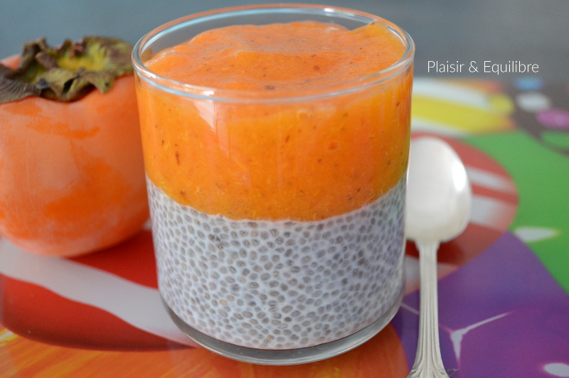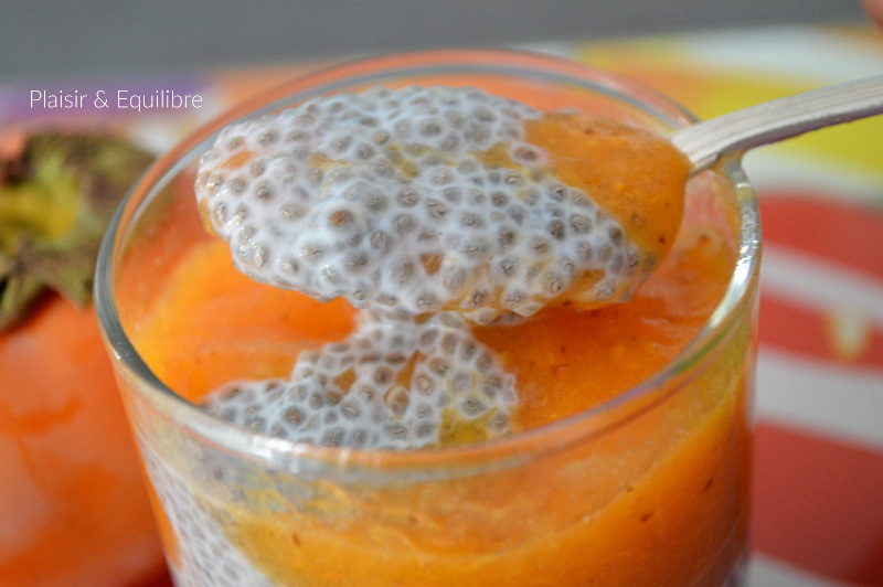 Je m’intéresse depuis peu aux graines de chia, ces petites graines provenant d’une plante originaire du Mexique qui présentent des qualités nutritionnelles apparemment très intéressantes. Riches en oméga 3, en minéraux et en fibres, elles se cuisinent sèches ou mélangées à un liquide, elles vont alors gonfler et avoir la consistance d’un pudding. Pour le moment, je ne les ai testées que de cette manière et j’aime beaucoup ! Pour un petit déjeuner vitaminé ou un dessert, ce chia pudding au kaki saura vous étonner. Mon kaki était bien mûr et très sucré, je n’ai ajouté qu’une demie cuillère de sirop d’érable dans mon pudding de graines de chia et si vous êtes plus bec sucré ou si votre kaki n’est pas pas trop mûr, n’hésitez pas à mettre une cuillère entière de sirop d’érable.