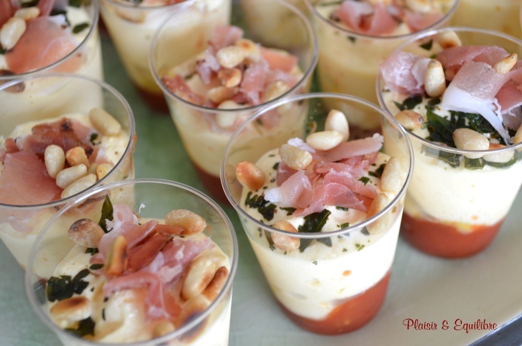 Verrines de tiramisu tomates, parmesan et jambon fumé