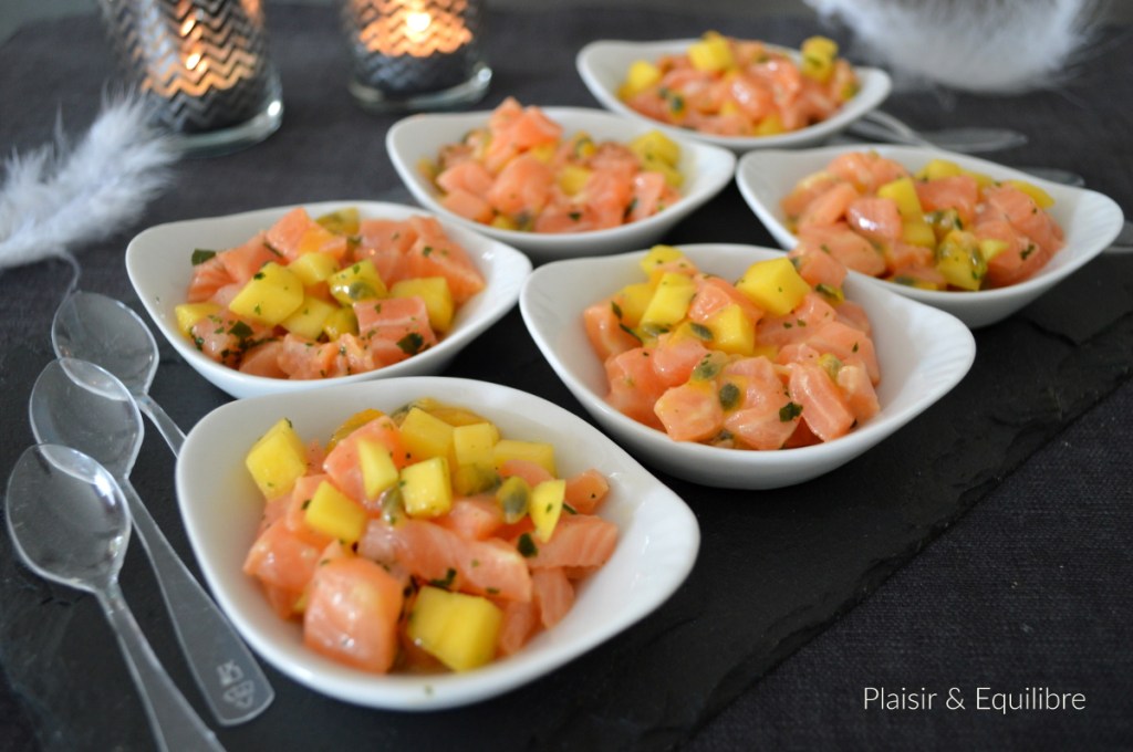 Coupelles de tartare de saumon à la mangue et aux fruits de la passion