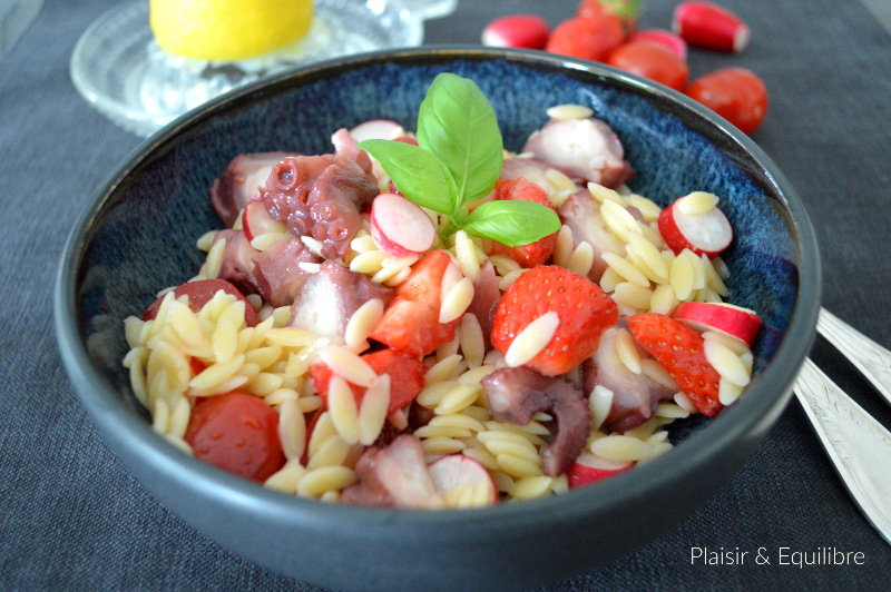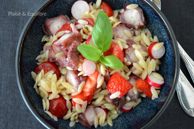 Laissez-vous surprendre par cette salade à l’association originale de pâtes orzo, fraises, tomates et poulpe ! J’aime beaucoup retrouver le parfum de la fraise dans les salades et le mariage avec la saveur iodée du poulpe est inattendu et réussi. Le fondant de ces petites pâtes orzo appelées aussi langue d’oiseau ou biavetta est très agréable servies bien fraîches. Une idée trouvée chez mon amie Jackie du blog La Cuisine de Jackie. J’ai légèrement modifié les quantités.