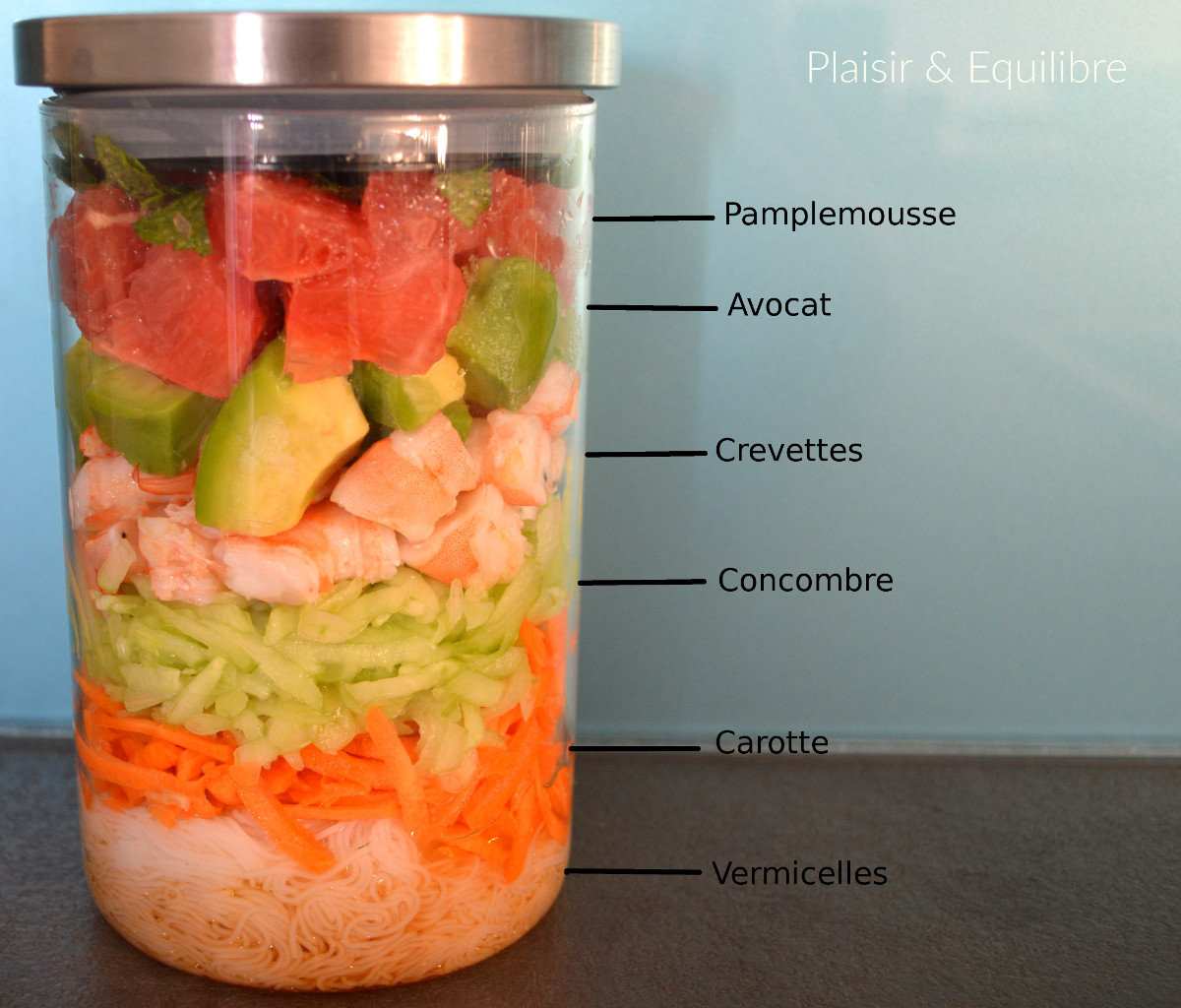 Dans chaque bocal, verser un peu de sauce. Ajouter une bonne quantité de vermicelles, des carottes puis des concombres, des crevettes, de l’avocat, du pamplemousse et terminer avec quelques feuilles de menthe ciselées.
