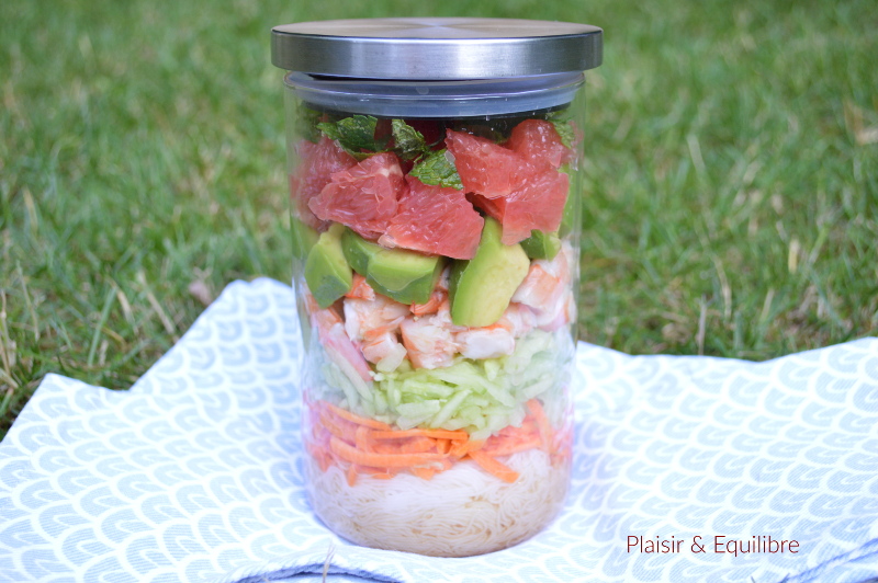 J’adore la présentation des salades en bocal, appelées aux États-Unis salad jar. La superposition des ingrédients de couleurs différentes met en appétit ! Comme Isabelle du blog Quelques Grammes De Gourmandise, la nouvelle marraine de la Bataille Food #115, a choisi pour thème de cette nouvelle édition « Mangeons dans un bocal ! », j’ai cédé à la tentation de cette tendance en proposant une salade fraîcheur d’inspiration thaïe dans un bocal. Ce défi culinaire a été créé par Jenna du Bistro de Jenna, Hélène du blog Keskonmangemaman ? est l’administratrice du jeu et de la page Facebook. La précédente marraine est Florence du blog Dans ma p’tite cuisine rose. Cette salade est d’inspiration thaïe, de part sa composition, vermicelles, carotte, concombre, crevettes et pamplemousse et pour la sauce qui l’accompagne, à base de nuoc mam, jus de citron vert, sauce soja et cassonade. Seul l’avocat, originaire d’Amérique Centrale, ne fait pas partie des salades thaïes mais j’adore en mettre dans mes salades.