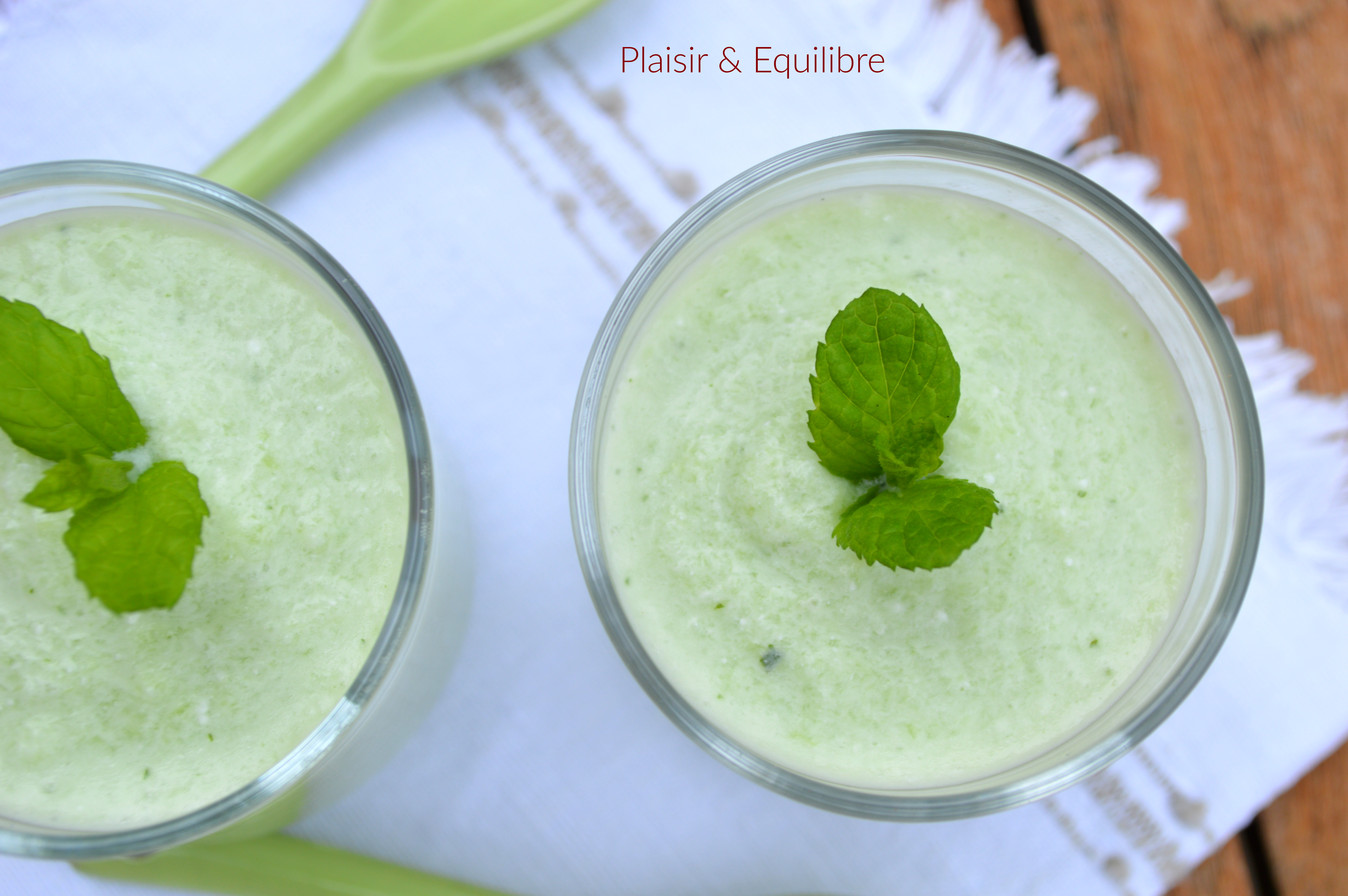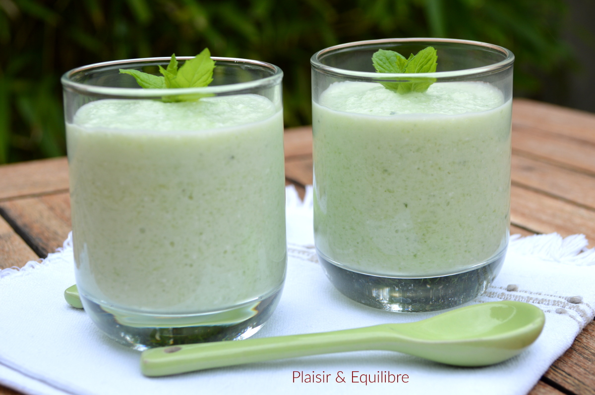 La chaleur donne envie de boire et manger frais, très frais. Le gaspacho est parfait pour cette saison, rafraîchissant, parfumé et sans cuisson, j’adore en consommer le soir après une chaude journée de travail. 10 petites minutes de préparation pour réaliser ce gaspacho désaltérant et délicieux ! Dans ce gaspacho se retrouve la fraîcheur du concombre, la douceur acidulée du lait ribot, le crémeux de la feta et le délicieux parfum de la menthe. Le lait ribot se trouve au rayon frais des supermarchés. Il est aussi possible de le faire vous-même, il suffit d’ajouter du jus de citron dans le lait et le laisser reposer 15 minutes. Le lait va cailler et obtenir un petit goût aigre. Rien de plus simple que ce gaspacho concombre, lait ribot, feta et menthe !
