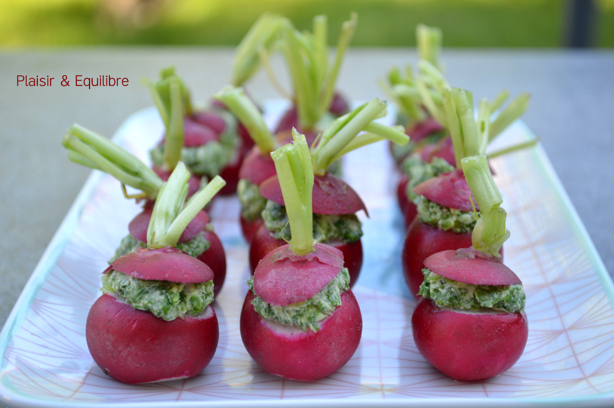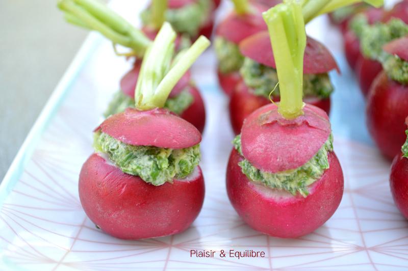 Le radis accompagne nombreux de mes apéros, servis avec un peu de sel ou du beurre, nous avons toujours plaisir à les croquer ! Eric Frechon dans son livre « Apéros » propose de préparer de manière originale le radis beurre en incorporant les fanes dans le beurre et en y ajoutant un peu de raifort. J’ai découvert cette belle idée sur le blog de Clarisse, Clarisse en cuisine qui l’avait elle-même trouvée chez Isabelle du blog La Cuisine d’ici et d’ISCA. Je me suis simplifiée la tâche en déposant le beurre sur le radis mais c’est sûr que c’est plus joli de le passer par la poche à douille comme le propose le Chef.