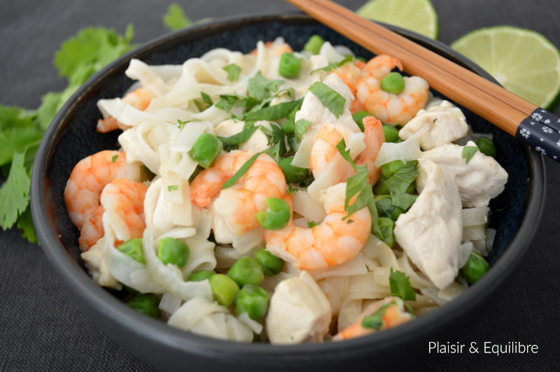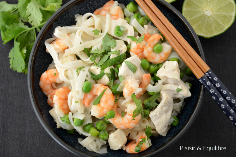 Le one pot pasta est le mode de cuisson idéal pour faire un plat rapide. Tous les ingrédients cuisent en même temps dans une grande poêle, il suffit juste de mélanger fréquemment. Je vous propose aujourd’hui une version thaïe du one pot pasta, avec des nouilles de riz, des crevettes, du poulet, du lait de coco et de la coriandre. Il faut compter 10 minutes de préparation et une quinzaine de minutes de cuisson. Je fais souvent ce one pot pasta Thaï aux crevettes et poulet, nous l’adorons à la maison, je prends enfin le temps de vous en proposer la recette pour participer au jeu Compile moi un menu (CMUM) animé par Nath du blog Une cuisine pour Voozenoo. La marraine de ce mois est Florence du blog Dans ma p’tite cuisine rose, elle a choisi pour thème « Plats complets express ». La recette initiale vient du très joli blog de Samar, Mes inspirations culinaires.