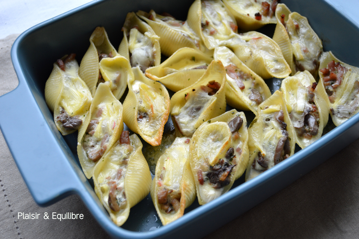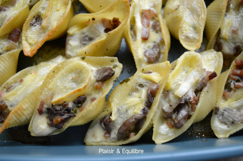 Il y avait longtemps que je n’avais pas fait de conchiglioni, ces grosses pâtes en forme de coquillage qui peuvent être farcies. C’est toujours un peu long à faire mais le résultat est vraiment très joli ! Cette fois je vous propose une recette automnale, des conchiglioni farcis aux champignons, lard et reblochon. Ces parfums nous ont énormément plu, nous en aurions d’ailleurs bien mangé un peu plus ! Avec cette recette je participe au défi « Les champignons » de Recettes.de proposé par Coco de Nice du blog Cuisine en folie.