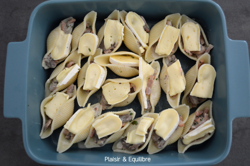 Couper le reblochon en fines tranches et en déposer un morceau sur chaque conchiglioni.