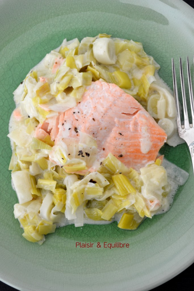 Lorsque les poireaux sont pratiquement cuits, ajouter les pavés de saumon. Poursuivre la cuisson durant 5 minutes environ.