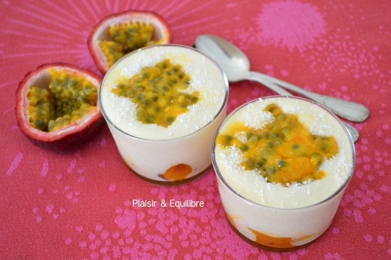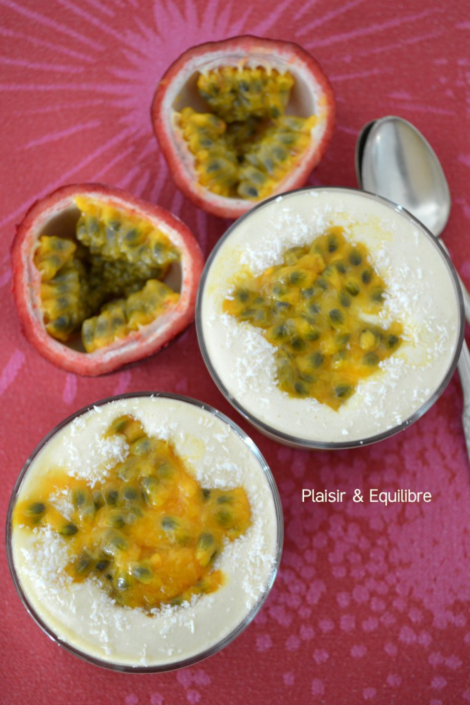 Au moment de servir, saupoudrer chaque verrine de noix de coco râpée et verser la pulpe d’un demi fruit de la passion sur chaque verrine. Servir bien frais et se régaler !