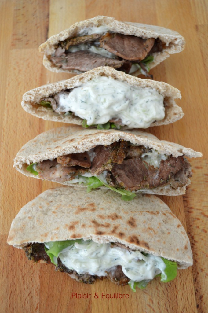 Couper les pains pitas en deux, les ouvrir et les garnir de salade, de lamelles de viande grillée et de tzatziki. Déguster de suite et se régaler !